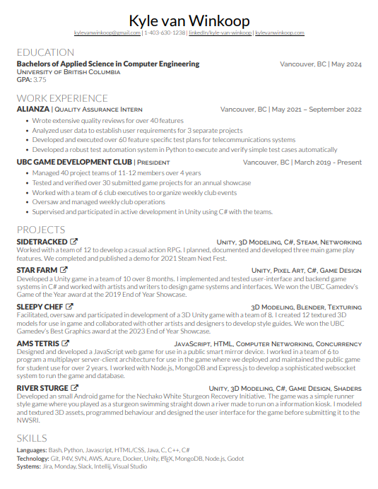 A computer engineer with experience in game development, quality assurance, network design, embedded systems and technical art. An active member of the game development community in Vancouver, passionate about creating games and creative experiences.